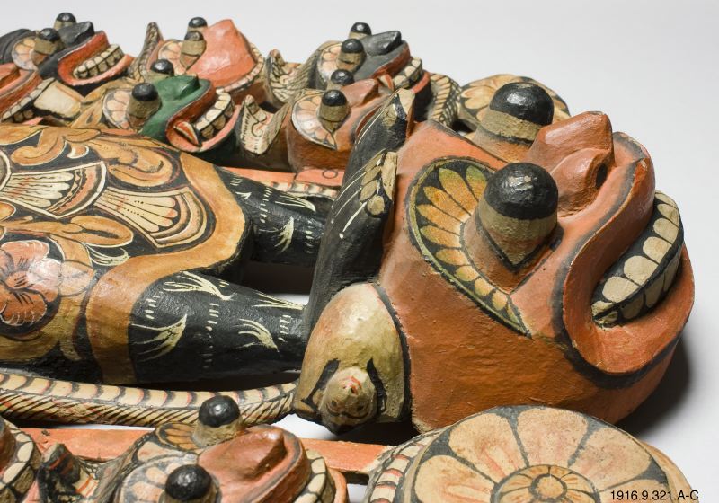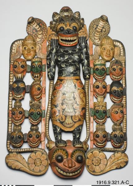 The mask at the top of the figure contains the usual ring of cobras, vattuva (Sin.), common to cobra demon masks. It comprises five cobras. All the cobras contain features of a spectacled cobra as indicated by the sign ¿S¿. On the bridge of the nose is a piece of decorated wood denoting a tilaka (Sin.) mark. The ear-ornaments are shaped like a todu (Sin.) with flower and foliage design. The two arms are bent upwards at the elbows. The hands are shaped to carry a human sacrifice.