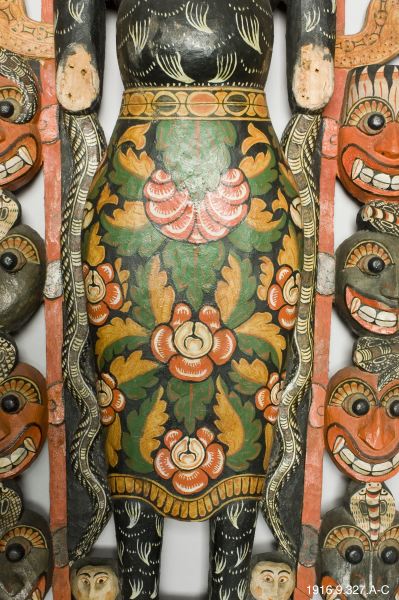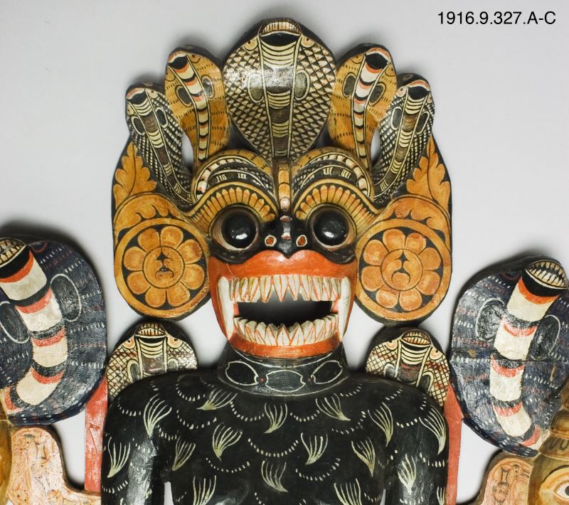 The mask at the top of the figure is similar to that of a cobra demon, naga rassaya (Sin.). It comprises a ring of five cobra-hoods, called vattuva (Sin.). The cobras are entwined and rise from the bridge of the nose. The ventrals follow the same geometric patterns found in specimen 1916.9.320. The mouth is that of a ferocious demon.