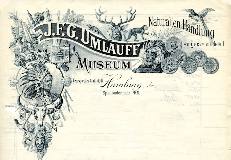 - J. F. G. Umlauff var ett tyskt handelshus och museum i Hamburg som grundades av Johann Friedrich Umlauff (1833-1889). Sonen Johannes Umlauff (1874-1951) tog sedan över. De köpte in och sålde etnografika och naturalia, inte minst sålde de till olika museer. De gav ut många kataloger. De köpte bland annat in etnografika från Carl Hagenbeck. (http://raai.library.yale.edu/site/index.php?globalnav=publication_detail&book_id=895)
